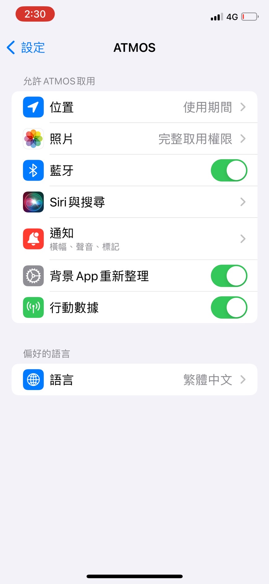 • 請確認是否允許 ATMOS 取用行動數據、藍芽、GPS (如下圖)